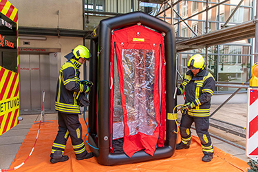 Innerhalb der Notaufnahme war es zum Austreten einer unbekannten Flüssigkeit gekommen. Nach unserer Ankunft warteten wir erste Maßnahmen der örtlichen Feuerwehr ab und begannen anschließend mit der Errichtung des Dekontaminationsplatzes.