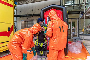 Als dieser dann einsatzbereit war, dekontaminierten wir mehrere Trupps, welche Kontakt mit dem mittlerweile identifizierten Gefahrstoff hatten. Zusätzlich leiteten wir anfangs den Regelrettungsdienst um, sodass die Funktion der Notaufnahme weiterhin gewährleistet war. Glücklicherweise stellte sich im Laufe des Aufbaus heraus, dass es sich bei diesem Szenario um eine Einsatzübung des 4. Gefahrgutzuges handelte.